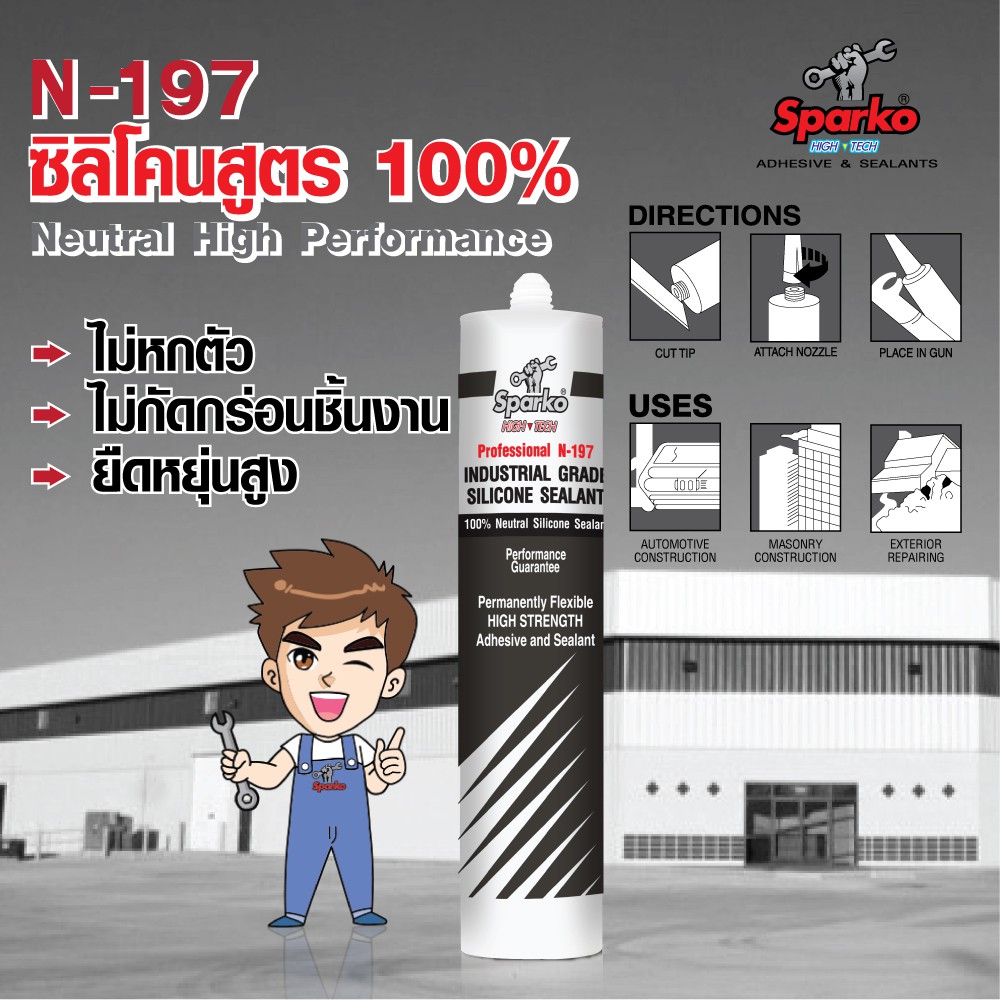 N-197 เป็นซิลิโคนยาแนวสูตรพิเศษแบบ High Modulus ผลิตจากซิลิโคนแท้ 100% แห้งตัวแบบเป็นกลาง (Neutral Cure) ปราศจากกรดและกลิ่นฉุน ให้แรงยึดเกาะสูง แข็งแรง ทนทาน เหมาะสำหรับงานติดตั้งวัสดุถาวรหรืองานที่ต้องการความแน่นหนาสูง เช่น การติดตั้งกระจกบานใหญ่ หรือรอยต่อขนาดเล็กที่ไม่ต้องการให้วัสดุยืดหดตัว