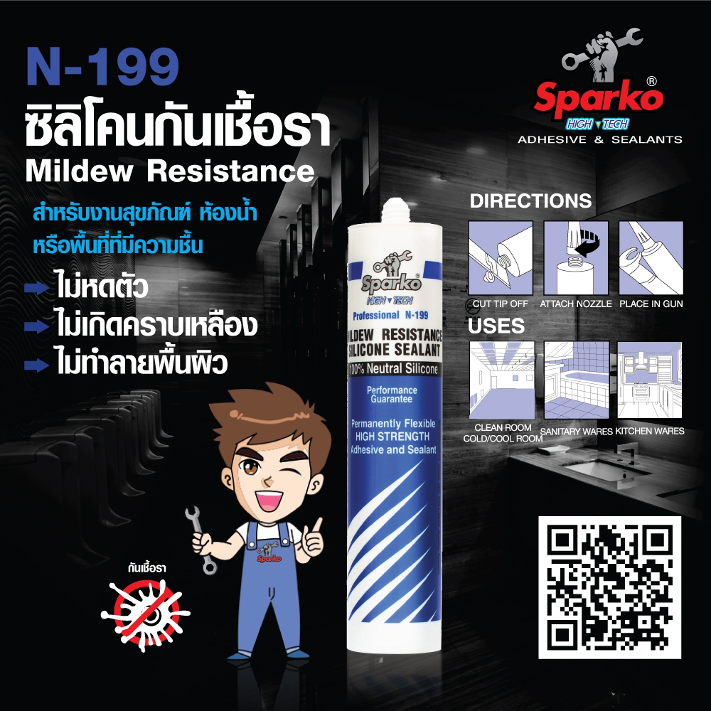 N-199 เป็นซิลิโคนยาแนวชนิด แห้งตัวแบบเป็นกลาง (Neutral Cure) คุณภาพสูง 100% ที่ได้รับการพัฒนาเป็นพิเศษด้วยการเติมสารต้านเชื้อราเกรดพรีเมียม เหมาะสำหรับใช้ในบริเวณที่มีความชื้นสูง เช่น ห้องน้ำ ห้องครัว และพื้นที่เปียก เพื่อป้องกันการเกิดคราบดำ และการเจริญเติบโตของเชื้อราได้อย่างมีประสิทธิภาพ